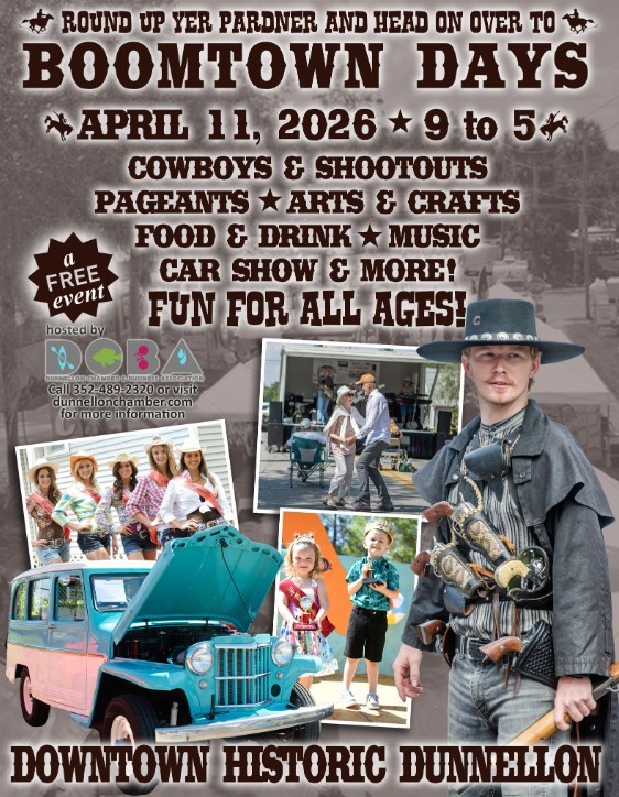 Come by and see us at Boomtown Days Dunnellon!! Don't miss out on the always fun Boomtown Days packed with food trucks, kid zone, beauty pageant, tons of local vendors, arts and crafts, cowboy shootout, live music and more!